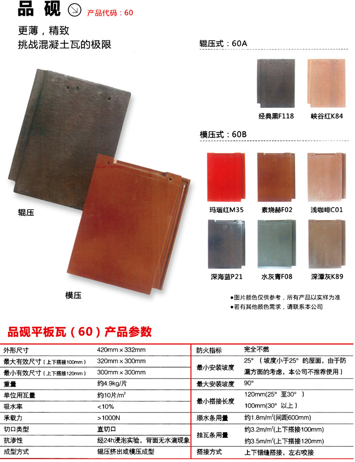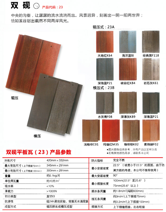 彩色水泥瓦運用應留意的是瓦較薄,它能承擔震動和溫度轉變的工作能力弱,因而在混凝土未做到抗壓強度時干萬不能產生震動。水泥瓦環境破壞的溫度差不能很大,若從溫室大棚內搬至戶外時要逐漸減溫。彩色水泥瓦的表層沒有微小細孔,因而在抗污層面是十分強的實際效果。一般在制造廠都是在其表層開展相對的解決工作中。戶外的室內裝修中會大規模的采用水泥瓦。目前市面上市場銷售的彩色水泥瓦,一部分顏色是經人工服務來解決產生的,這種彩色水泥瓦使用壽命為百年老。較為顯著的是現階段銷售市場上的彩色水泥瓦,大部分是上色著色進而成的狀況,那樣可供大家選擇自己較為喜愛的顏色來裝飾設計房頂。